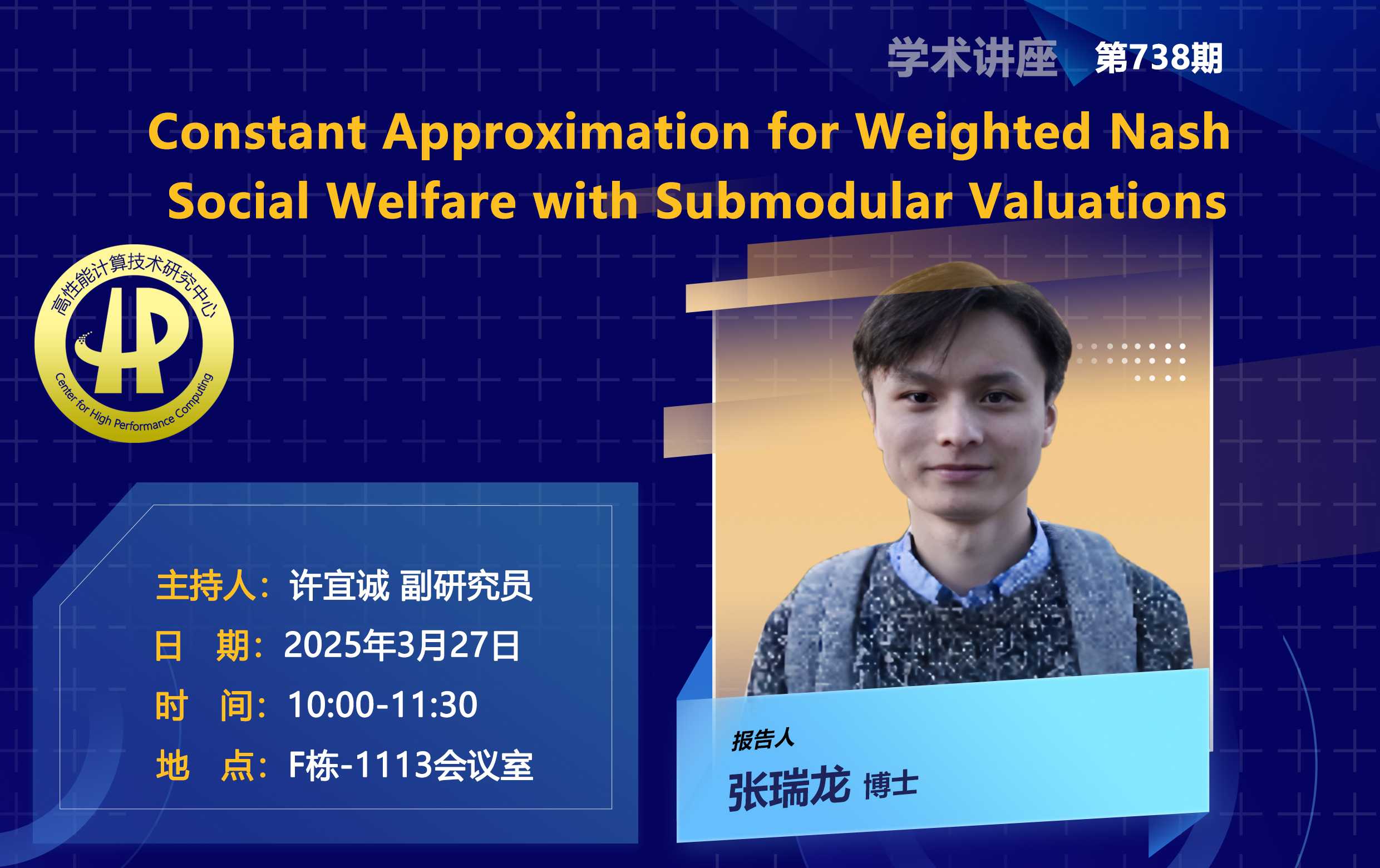 数字所高性能中心学术讲座于3月27日10:30-11:30在F1113会议室举行,本次讲座邀请德国慕尼黑工业大学张瑞龙博士作题为“Constant Approximation for Weighted Nash Social Welfare with Submodular Valuations”的报告。本次报告由数字所许宜诚副研究员主持...